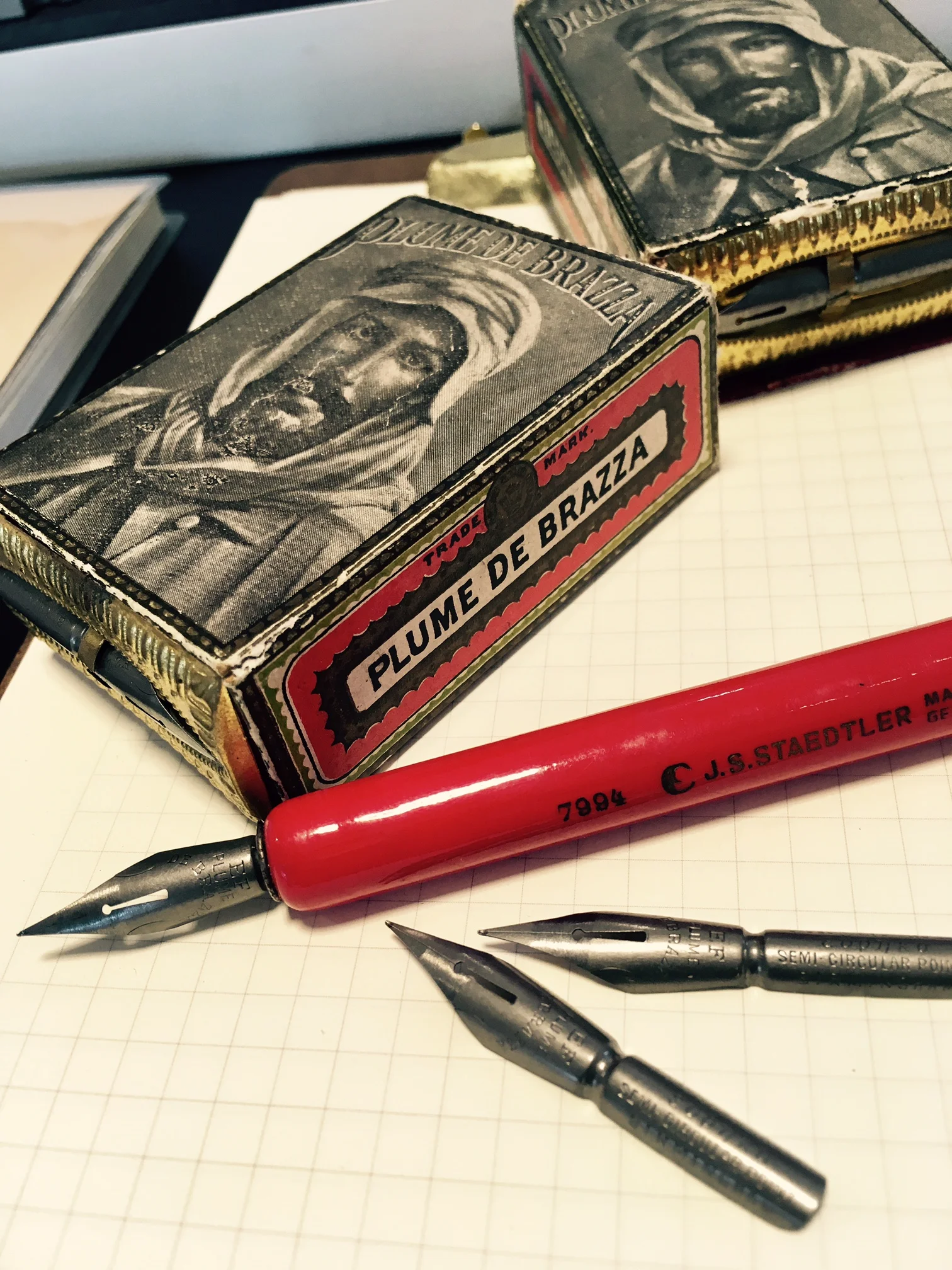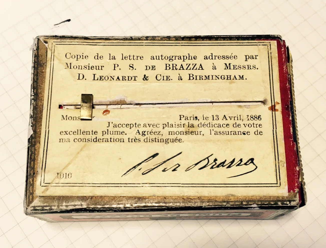 這款筆尖就是由英國的D. Leonardt & Co. 在1920~30年代所生產的紀念筆尖,針對法國市場所發行,自然都使用法文來說明。而精緻的側面金屬面,還附上筆尖的樣品。由於金屬裝飾面與紙盒的連結處較為脆弱,因此在紙盒的底部,設計了一個金屬小推桿,方便使用者在不損壞紙盒的狀況下將紙盒推出。而精緻的筆尖做工,也已經不會在現代生產的筆尖上發現。